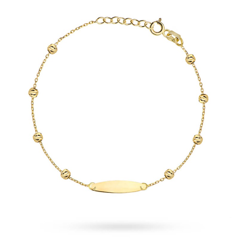 | Delikatna złota bransoletka doskonała do grawerowania na prezent z okazji chrztu, pierwszej Komunii czy też innej okazji. Głównym elementem jest blaszka, na której można wykonać spersonalizowany grawer w naszej pracowni. Dodatkową ozdobę stanowią drobne, lśniące kuleczki, które dodają bransolecie lekkości i elegancji. Długość blaszki 25 mm Długość bransoletki 17 cm + 2 cm przedłużka |
