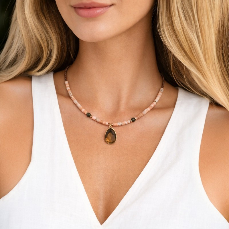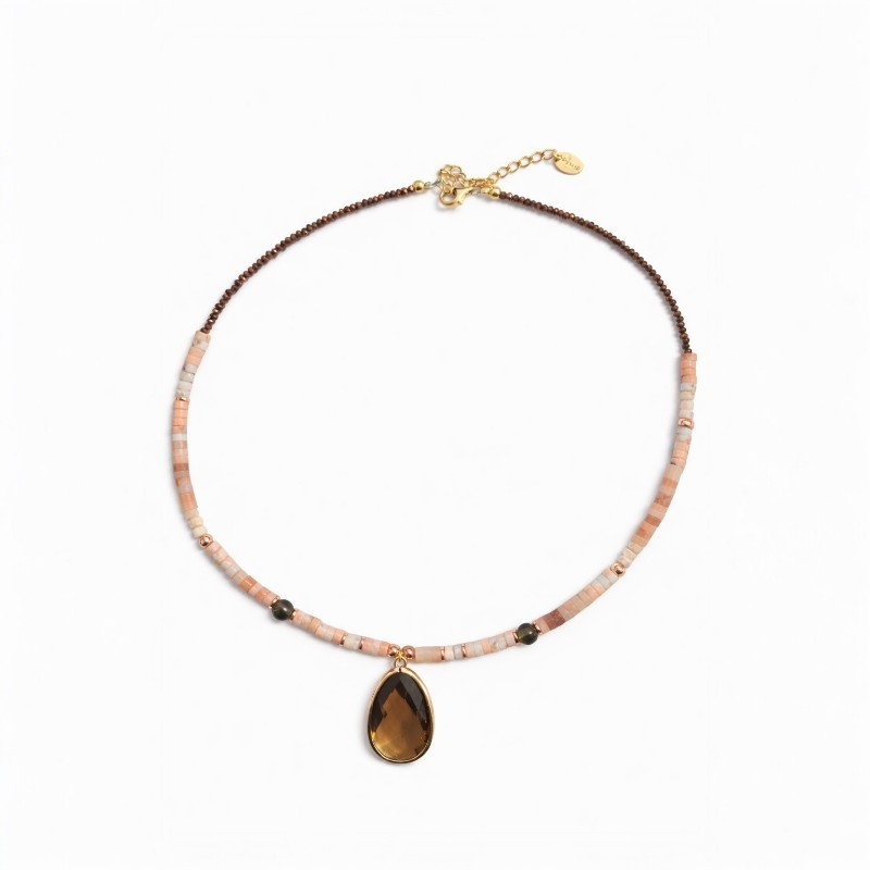 Unikalny naszyjnik marki Taxor, łączący w sobie naturalne piękno kamieni i elegancki design. Biżuterię z kamieniami naturanymi wykonujemy ręcznie w naszej pracowni z dbałością o każdy detal. Kompozycję tworzą jaspisy, hematyty, kwarc i kryształek, które razem nadają biżuterii wyjątkowego charakteru. Całość dopełniają srebrne i metalowe elementy dopracowane z dbałością o każdy detal. Dzięki możliwość regulacji długości, naszyjnik dopasowuje się do rożnych stylizacji i preferencji. Każdy egzemplarz jest wyjątkowy - kamienie naturalne mogą różnić się odcieniem i strukturą, co podkreśla ich unikalny charakter.