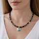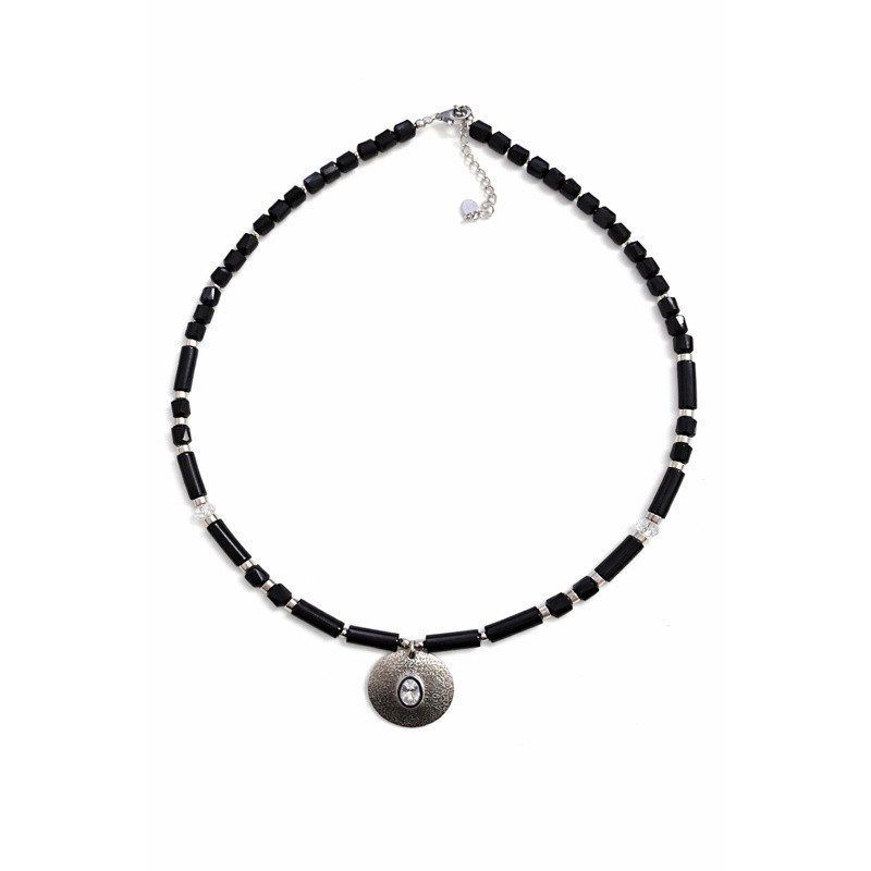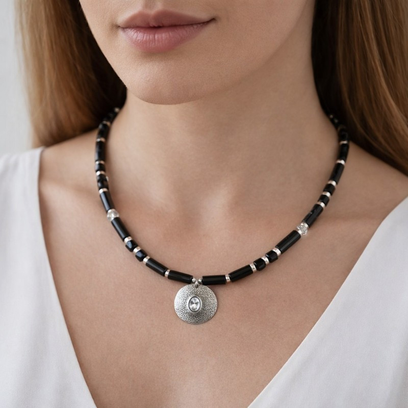 Unikalny naszyjnik marki Taxor, łączący w sobie naturalne piękno kamieni i elegancki design. Biżuterię z kamieniami naturanymi wykonujemy ręcznie w naszej pracowni z dbałością o każdy detal. Kompozycję tworzą onyks, hematyt i kryształy svarowskiego, które razem nadają biżuterii wyjątkowego charakteru. Całość dopełniają srebrne i metalowe elementy dopracowane z dbałością o każdy detal. Dzięki możliwość regulacji długości, naszyjnik dopasowuje się do rożnych stylizacji i preferencji. Każdy egzemplarz jest wyjątkowy - kamienie naturalne mogą różnić się odcieniem i strukturą, co podkreśla ich unikalny charakter.