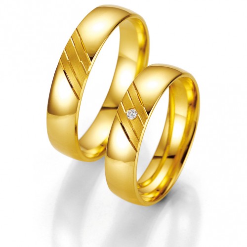 Obrączki z kolekcji SmartLine model 7015 firmy Breuning wykonane z żółtego złota w technologii bezszwowej. Niewielki fragment obrączki jest matowany a pozostała część polerowana. Matowana część jest dodatkowo ozdobiona czterema skośnymi nacięciami. W damskim wzorze producent proponuje oprawę pojedynczego brylantu o masie 0.015 ct barwie H i czystości SI. Można oprawić brylant o wyższej czystości.