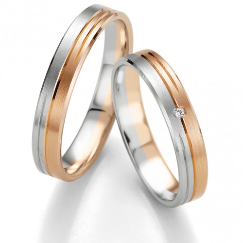 Obrączki z białego i różowego złota o szerokości 4 mm z kolekcji Smart Line firmy Breuning wzór 7097 wykonane w technologii bezszwowej. Bardzo interesujący i oryginalny model wykonany z matowanego złota. W obrączce damskiej producent proponuje ciekawą oprawę brylantu o masie 0.01 ct barwie H i czystości SI. Można oprawić większą ilość brylantów.