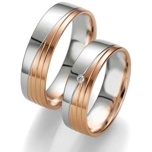 Obrączki z białego i różowego złota o szerokości 6 mm z kolekcji Smart Line firmy Breuning wzór 7113 wykonane w technologii bezszwowej. Bardzo interesujący i oryginalny model, w którym powierzchnia z różowego złota jest matowa a z białego polerowana. W obrączce damskiej producent proponuje ciekawą oprawę brylantu o masie 0.015 ct barwie H i czystości SI. Można oprawić większą ilość brylantów.
