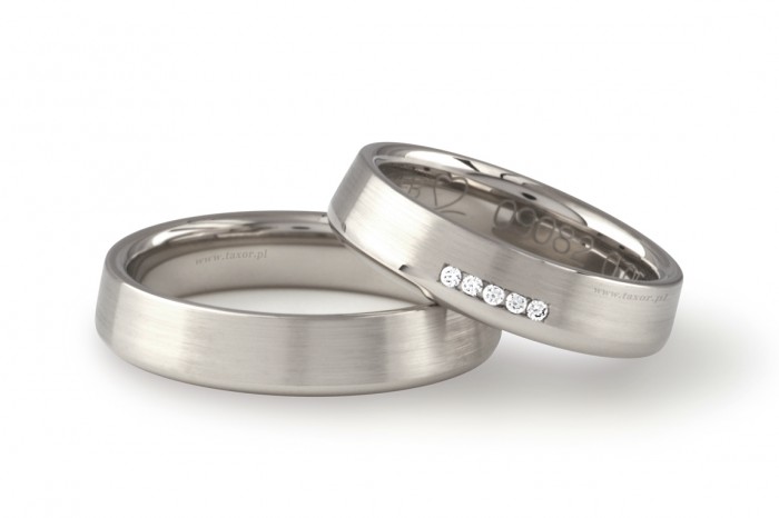 Najwyższej jakości obrączki platynowe o szerokości 5 mm wykonane ze stopu próby 950 w technologii bezszwowej. Dość masywne o stożkowym kształcie, bardzo wygodne w noszeniu. W obrączce damskiej oprawiono brylanty o łącznej masie 0.125 ct H/Si. Wielkość i ilość brylantów można zmienić.
