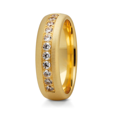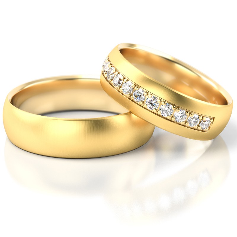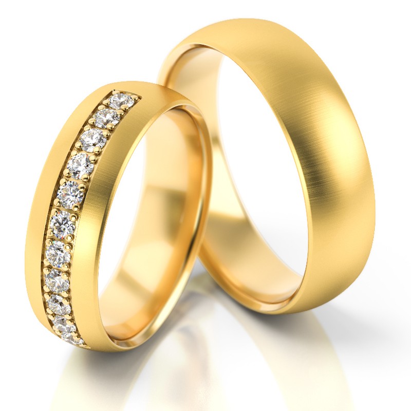 Obrączki są dość masywne. Ich szerokość standardowo wynosi 6 mm a wysokość profilu 1.6 mm. Przy tych wymiarach waga pary przekracza 12 g. W wersji komfortowej obrączka posiada wyoblenie (soczewkowy kształt) od strony wewnętrznej. Producent proponuje zmatowanie powierzchni matem M2, ale można użyć innego matu lub całą powierzchnię wypolerować. Damską obrączkę można ozdobić cyrkoniami lub brylantami umieszczonymi w rzędzie. Ilość kamieni dowolna. Istnieje też możliwość zwiększenia wagi obrączek i wykonania tego wzoru w wersji bardziej masywnej. Wszelkie odstępstwa od wersji standardowej najlepiej uzgodnić z nami klikając w link "zapytaj o produkt".