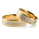 Eleganckie obrączki dwukolorowe w wersji matowanej wykonane z białego i żółtego złota w technologii bezszwowej. Niesymetrycznie oprawione kamienie przy jednej z krawędzi oraz nierówne szerokości kolorowych pierścienina czynią ten wzór bardzo oryginalnym i dodają obrączkom niezwykłego uroku.