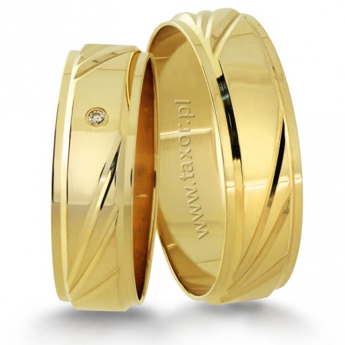 Obrączki ślubne firmy Zirkon wzór R-20 wykonane z żółtego złota w technologii bezszwowej. Obrączki ozdobione delikatnymi nacięciami wyglądają interesująco.