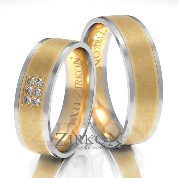Na zdjęciu zaprezentowano obrączki ślubne o płaskim profilu wykonane z dwóch kolorów złota próby 585. Brzegi wykonane są z polerowanych pierścieni z białego złota a środkowy pierścień z matowanego żółtego. Waga i cena podane są dla standardowych wymiarów o szerokości 6 mm.. Producent umożliwia wykonanie tego wzoru w wersji lżejszej lub bardziej masywnej. Dostępna jest opcja rodowania  białego złota. Warto zaznaczyć tę opcję, gdyż uzyskujemy w ten sposób śnieżno-biały kolor doskonale kontrastujący z żółtym złotem. W damskiej obrączce producent proponuje ciekawą oprawę kamieni - cyrkonii lub brylantów Si/H. Zmiana wymiarów profilu pozwala na zamówienie pary obrączek o różnej szerokości dla pana i pani. Soczewkowy kształt wewnątrz czyni obrączki znacznie wygodniejszymi w użytkowaniu.