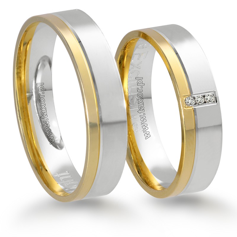 Obrączki ślubne X-19 o szerokości 5 mm zaprezentowane na zdjęciu są wykonane z połączonych trwale ze sobą dwóch pierścieni z żółtego i białego złota o różnej szerokości. Zewnętrzna strona obrączki jest płaska. Taka biżuteria o ponadczasowym wzornictwie i kształcie cieszy się największym powodzeniem. Pieścień wykonany z białego złota jest szerszy, ale można kolory zamienić miejscami. Można również zastąpić żółte złoto różowym. Różne kolory złota są oddzielone od siebie delikatnym rowkiem. Białe złoto na życzenie klienta pokrywamy galwanicznie rodem. Zabieg ten ma na celu poprawę estetyki i zwiększenie kontrastu pomiędzy złotem o różnych kolorach.