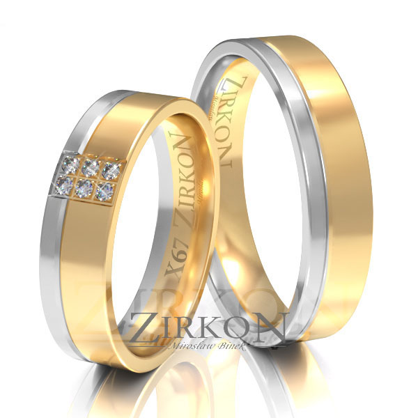 Zaprezentowane dwukolorowe obrączki mają płaski profil i szerokość 5 mm. Dwa pierścienie o różnych szerokościach wykonane z białego i żółtego złota połączone są w sposób trwały stanowiąc monolityczną całość. Dla poprawy estetyki oddzielone są od siebie wytoczonym na całym obwodzie delikatnym rowkiem. W obrączce damskiej można w dwóch poprzecznych rzędach oprawić 6 szt kamieni - cyrkonii lub brylantów. Brylanty mają czystość Si i barwę H.