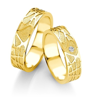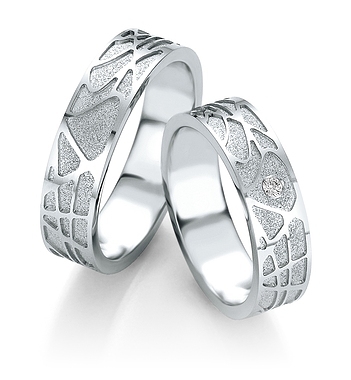 Oryginalny przestrzenny wzór na powierzchni czyni ten model wyjątkowym. Obrączki wykonane są z białego złota palladowego. W stopie nie ma nawet śladowych ilości niklu, co jest niezwykle istotne dla alergików. Biały kolor złota uzyskuje się przez dodatek palladu zamiast niklu. Pallad zapewnia również piękny śnieżno-biały kolor stopu. W modelu damskim producent proponuje oprawę pojedynczego brylantu masie 0.035 ct, barwie H i czystości SI. Technologia bezszwowa zapewnia idealnie okrągły kształt pierścienia i dużą wytrzymałość, dzięki czemu można ją w przyszłości obrączkę powiększyć lub zmniejszyć. Powierzchnia biżuterii Breuning jest specjalnie utwardzana, żeby zwiększyć jej odporność na ścieranie.