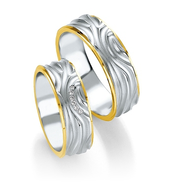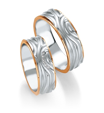 Wzór o interesującym kształcie wykonany jest z białego złota z żółtymi lub różowymi krawędziami. Obrączka damska ozdobiona brylantami o łącznej masie 0.033 ct, barwie H i czystości SI. Biżuteria ślubna Breuning - to najwyższa jakość i perfekcja wykonania. Białe złoto jest całkowicie pozbawione niklu. Biały kolor złota uzyskuje się przez dodatek palladu. Pallad jest metalem znacznie droższym, ale nie uczula i zapewnia piękny śnieżno-biały kolor stopu. Elementy z różnych kolorów złota są łączone metodą sienteringu , czyli spiekania bez lutu. Taka spoina jest niezwykle wytrzymała, niewidoczna i nie ma żadnych przebarwień, które pojawiają się w przypadku połączeń lutowanych. Technologia bezszwowa zapewnia obrączkom idealny kształt i dużą wytrzymałość. Obrączka nie ma łączenia na obwodzie i można ją w przyszłości powiększyć lub zmniejszyć. Powierzchnia biżuterii jest specjalnie utwardzana.